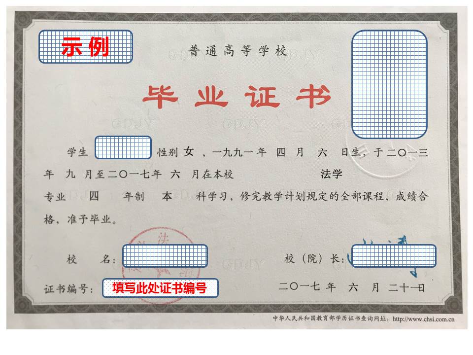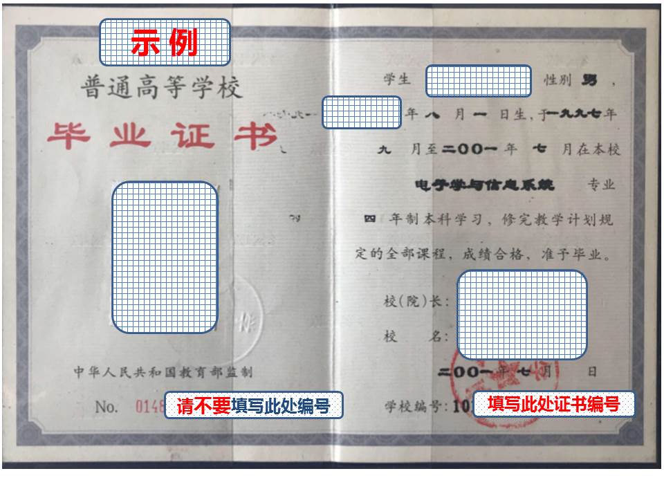 (7)学位以及毕业证书编号应填写证书中载明的“证书编号”或者“学校编号”,请参考样例1或样例2。